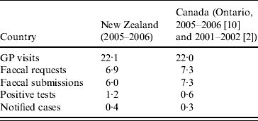 (1) The number of community cases of AGI, GP consultations, and faecal samples requested and provided were determined by a nationwide 12-month (February 2006–January 2007) telephone survey [Reference Adlam8]. Community case data were adjusted to correct for age, gender and ethnicity, based on results from the 2006 New Zealand Census.