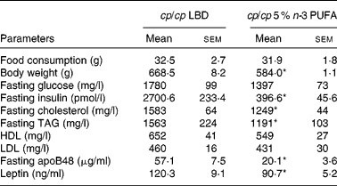 Table 2 Physical and fasting biochemical parameters of obese (cp/cp) male JCR:LA-cp rats fed a lipid-balanced control diet (LBD) or a 5 % n-3 PUFA diet