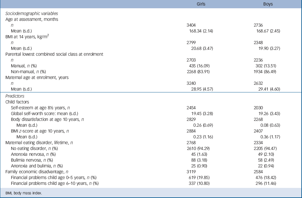 Weight and shape concern at age 14 years was assessed using three questions from the McKnight Risk Factor Survey: Reference Shisslak, Renger, Sharpe, Crago, McKnight and Gray16 ‘In the past year, how happy have you been with the way your body looks?’; ‘In the past year, how much has your weight made a difference to how you feel about yourself?’; ‘In the past year, how much have you worried about gaining a little weight (as little as 1 kilo)?’. Four responses on a Likert scale were used (from ‘very unhappy’ or ‘not at all’ to ‘very happy’ or ‘a lot/all the time’). The three questions were summed to generate a continuous score. Cronbach's alpha in this sample was 0.66. Pressure to lose weight was assessed using an adapted version of the Perceived Sociocultural Pressure Scale. Reference Stice17 Participants were asked to rate the statements: ‘I have felt pressure to lose weight: (a) from my friends, (b) from my family, (c) from the boys/girls I have gone out with, and (d) from the media (e.g. TV, magazines)’ on a four-point Likert scale (from ‘not at all’ to ‘a lot’). Items were summed to obtain a total score; Cronbach's α = 0.71 in this sample. Body dissatisfaction was assessed using the Body Dissatisfaction Scale; Reference Stice18 this scale asks individuals to rate their satisfaction with nine body parts on a Likert scale, from ‘extremely satisfied’ to ‘extremely dissatisfied’. Questions were slightly adapted in the female questionnaire version (‘body build’ in the male version was replaced by ‘breasts’) following feedback from the ALSPAC teenage advisory panel. A continuous score was derived, with higher values indicating higher dissatisfaction. Cronbach's á was 0.92 for the male version and 0.91 for the female version in this study. Missing items on each of the three eating disorder cognitions scales were prorated for individuals who had fewer than 20% items missing in each scale.