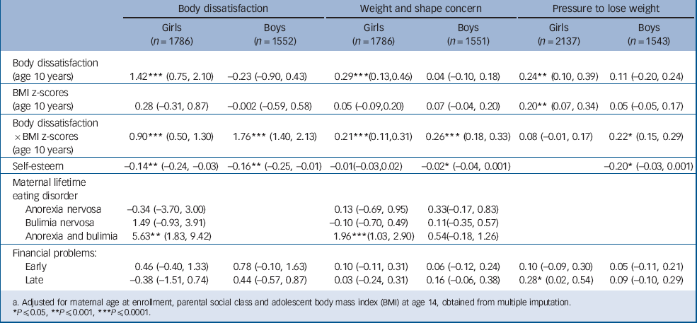Weight and shape concern was significantly associated with most predictors across genders in univariable analyses (online Table DS1). Multivariable analyses revealed differential effects by gender: childhood body dissatisfaction and maternal lifetime anorexia and bulimia were prospectively associated with higher weight and shape concern at age 14 years in girls (respectively B = 0.29, 95% CI 0.13–0.46; B = 1.96, 95% CI 1.03–2.90; P≤0.0001) but not in boys (Table 3). Although the interaction between body dissatisfaction and BMI at age 10 years predicted higher weight and shape concern across genders (in girls B = 0.21, 95% CI 0.11–0.31; in boys B = 0.26, 95% CI 0.18–0.33), higher self-esteem remained predictive of lower weight and shape concern scores only in boys (Table 3).
