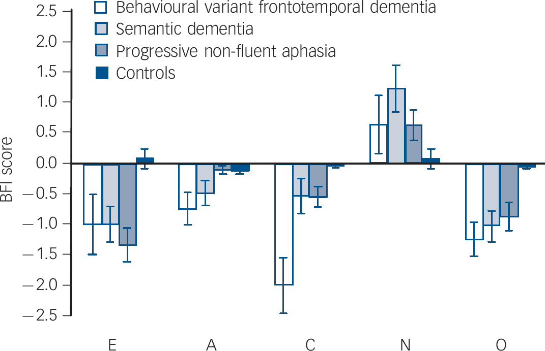 (a) Behavioural variant frontotemporal dementia subgroup; (b) progressive non-fluent aphasia subgroup; (c) semantic dementia subgroup; (d) control group. BFI, Big Five Inventory; E, extraversion; A, agreeableness; C, conscientiousness; N, neuroticism; O, openness.