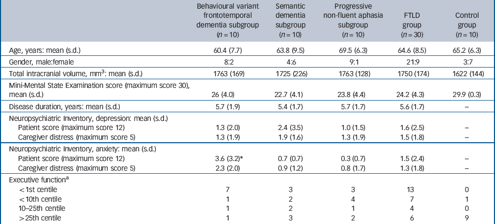 Thirty individuals (mean age 64.6 years (s.d. = 8.5); 21 males) attending the tertiary cognitive disorders clinic at the National Hospital for Neurology and Neurosurgery with clinical diagnoses representing each of the major canonical syndromic subgroups of FTLD (10 with behavioural variant frontotemporal dementia, 10 with semantic dementia and 10 with progressive non-fluent aphasia) according to current consensus criteria Reference Neary, Snowden, Gustafson, Passant, Stuss and Black10,Reference Adlam, Patterson, Rogers, Nestor, Salmond and Acosta-Cabronero22 participated in the study. The diagnosis in each individual was supported by detailed neuropsychological assessment. Depression and anxiety symptoms exhibited by the participant cohort were indexed using the Neuropsychiatric Inventory (NPI). Reference Cummings, Mega, Gray, Rosenberg-Thompson, Carusi and Gornbein23 Executive function was assessed using Part B of the Trail Making Test Reference Reitan24 and the task-switching component of the Trail Making subsection of the Delis–Kaplan Executive Functions System. Reference Delis, Kaplan and Kramer25 Clinical and demographic details of all participants are summarised inTable 1. The mean age of the progressive non-fluent aphasia subgroup was significantly older (P<0.05) thgan the behavioural variant frontotemporal dementia subgroup; syndromic subgroups did not differ in gender distribution, mean Mini-Mental State Examination (MMSE) Reference Folstein, Folstein and McHugh26 score or disease duration. The mean NPI depression score was 1.6 (s.d. = 2.5) and mean anxiety score was 1.5 (s.d. = 2.4) (maximum score 12) for the combined FTLD cohort; in a subgroup analysis the mean anxiety score in the behavioural variant frontotemporal dementia subgroup (mean 3.6 (s.d. = 3.2)) was significantly higher (P = 0.01) than for other subgroups. Two-thirds of participants (n = 20) scored below the tenth centile on tests of executive function.