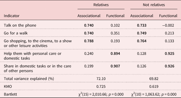 Initially, in this second study the responses to the following two questions were used: ‘How frequently do you do each of the following activities with your relatives aged over the age of 65 with whom you do not live, although it is with only one of them?’ and ‘How frequently do you do each of the following activities with persons aged over 65 who are not relatives and with whom you do not live, although it is with only one of them?’ In both questions the activities considered in the questionnaire were a total of six: Talk on the phone, Talk in person, Go for a walk, Go shopping, to the cinema or to a show or do some other leisure activity, Help with self-care or with household tasks and Share in household tasks or the care of other elders. The analytical strategy consisted, firstly, of identifying, through confirmatory factor analysis, the possible existence of one or more of the dimensions of intergenerational solidarity proposed by Bengtson and Roberts (Reference Roberts, Richards and Bengtson1991), both intrafamilial and extrafamilial.
