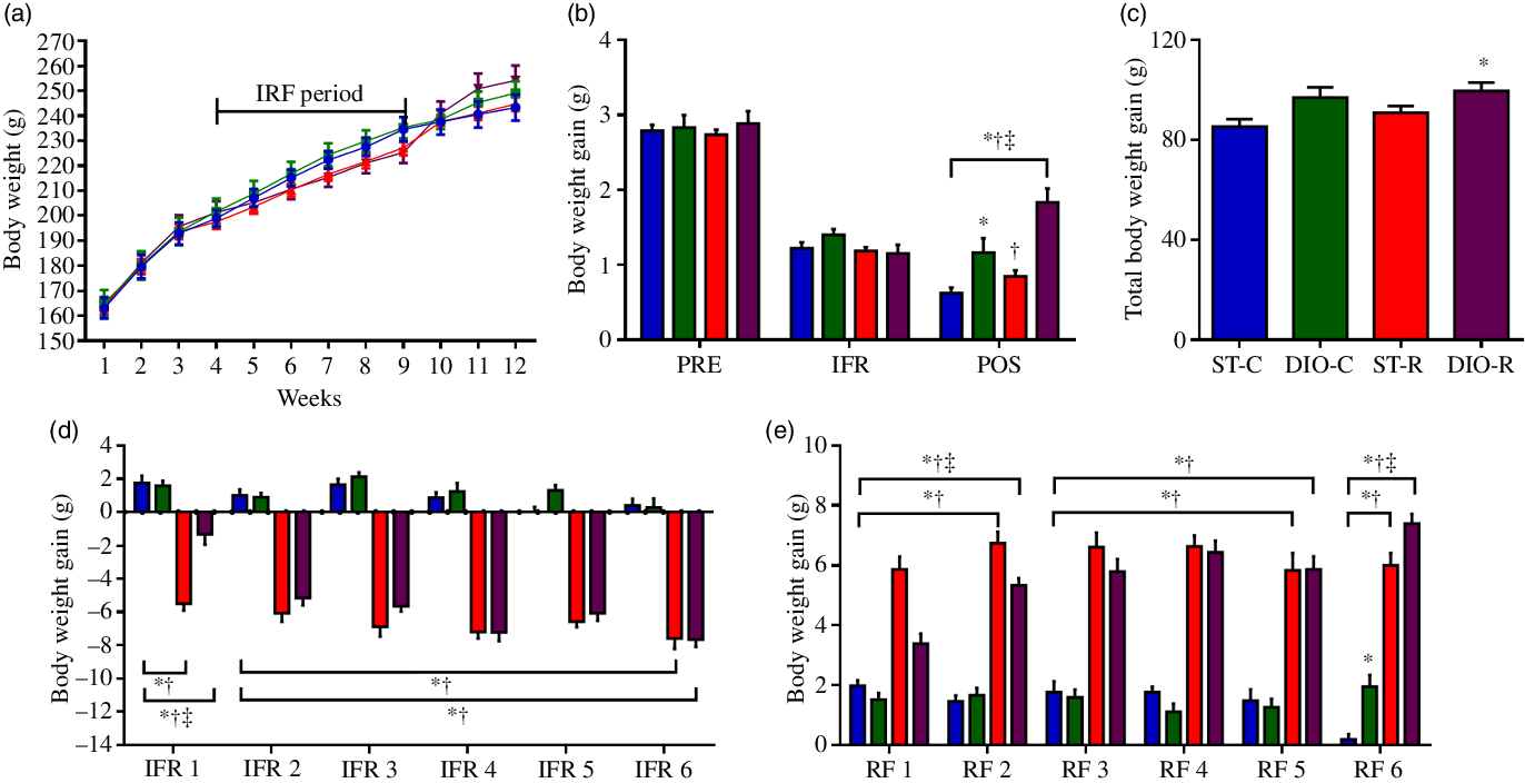 , DIO-R. (b) Body weight gain, before (PRE), during (IFR) and after (POS) IFR. (c) Total body weight gain at the end of the trial period. (d) Body weight gain on each effective restraint cycle during IFR. (e) Body weight gain in each refeeding (RF) cycle during IFR.