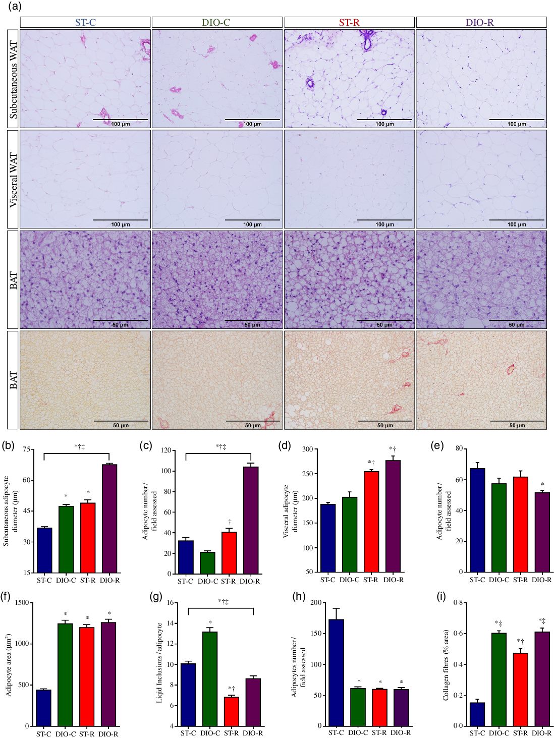 , DIO-R. Data were analysed by one-way ANOVA followed by Bonferroni post-test. P < 0·05 * v. ST-C, † v. DIO-C, ‡ v. ST-R.