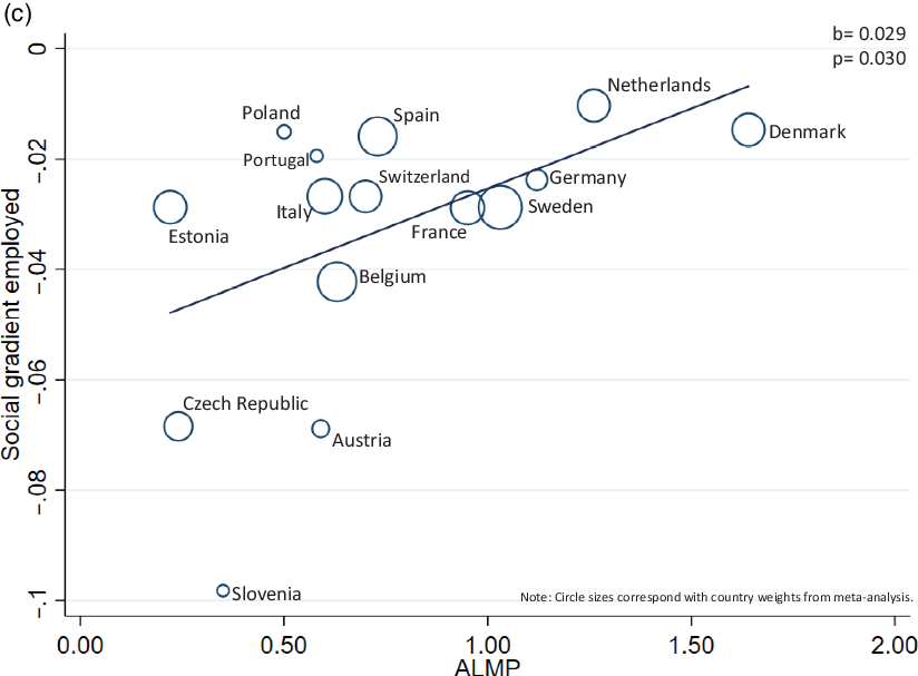FIGURE 4d: Association between social gradient in staying employed and active labor market expenditures as percentage of GDP.
