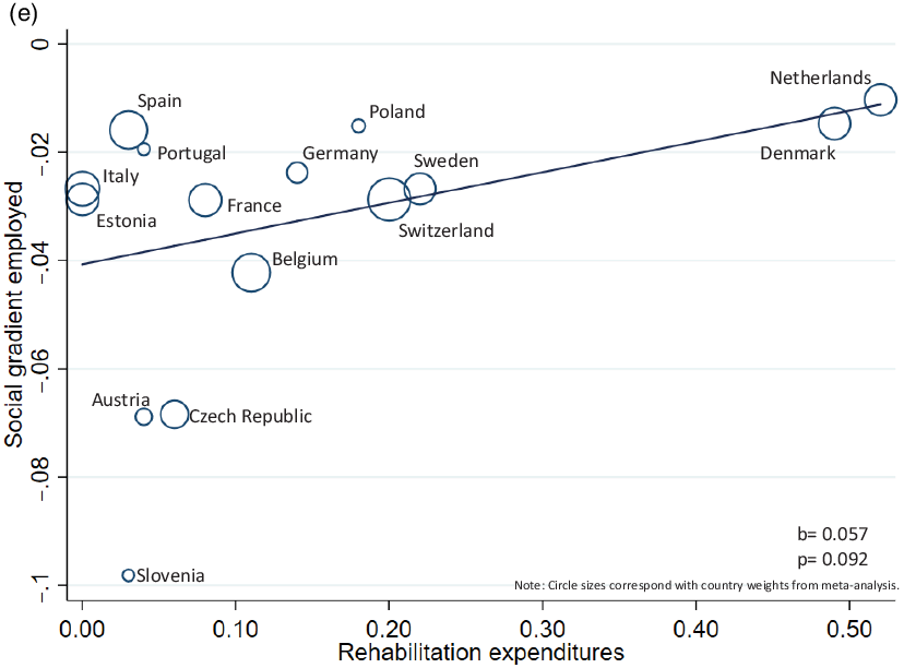 FIGURE 4e: Association between social gradient in staying employed and rehabilitation expenditures as percentage of GDP.