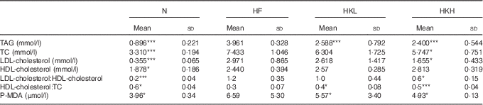 N, normal control; HF, group of hamsters fed a high-fat diet only with normal water; HKL, group of hamsters fed the high-fat diet with normal water and heat-killed Lactobacillus reuteri GMNL-263 5×108 cells/kg per d via oral gavage; HKH, group of hamsters fed the high-fat diet with normal water and heat-killed L. reuteri GMNL-263 2·5×109 cells/kg per d via oral gavage; TC, total cholesterol; P-MDA, plasma malondialdehyde.
