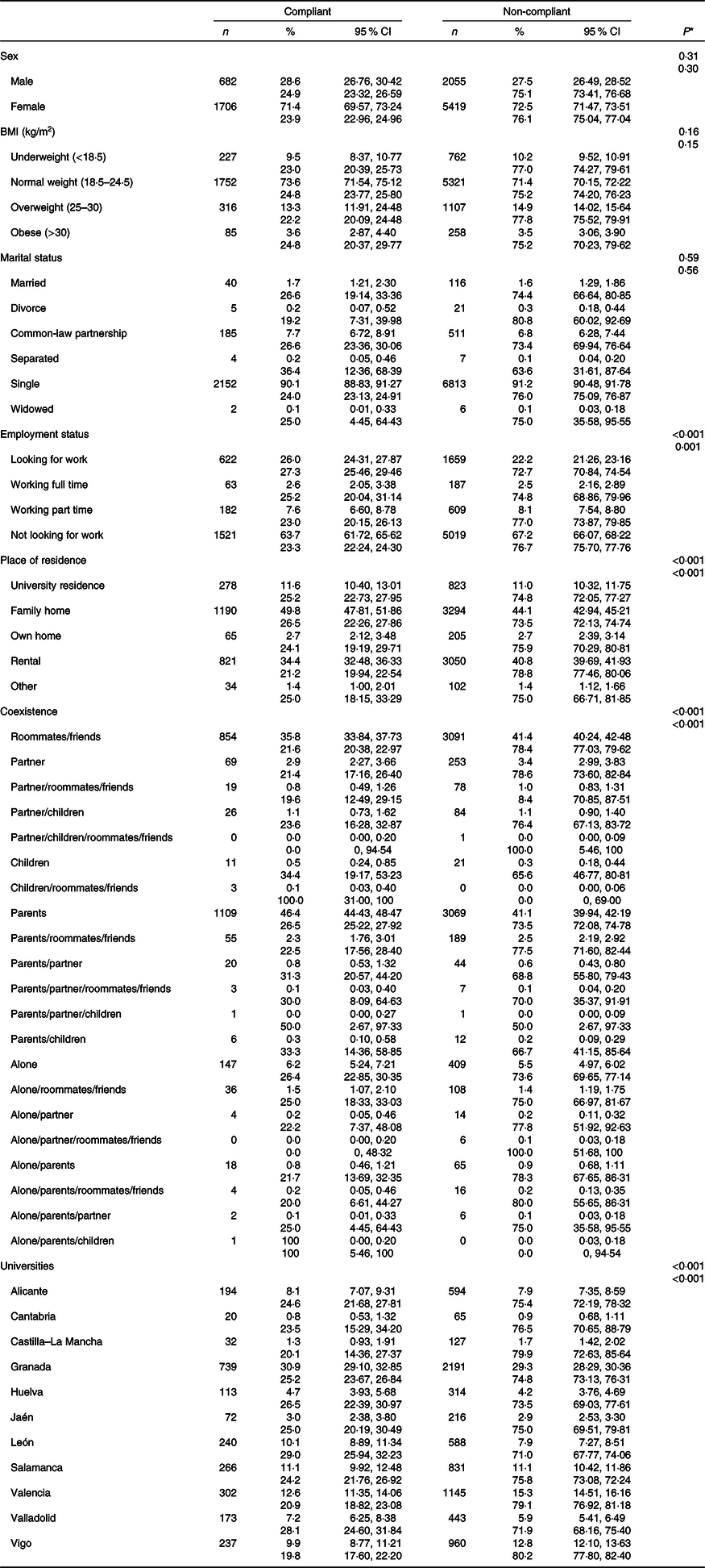 Table 1 shows compliance with pulses consumption recommendations depending on location and living situation without re-categorisation. Of the students in the eleven participating universities, 75·8 % presented an inadequate consumption of pulses. It is noted that there was no significant difference between compliance with the frequency of consumption of pulses according to sex (P = 0·299), BMI (P = 0·151) or marital status (P = 0·558). However, regarding the frequency of consumption of pulses according to the current situation in terms of work and study, there was a significant difference (P = 0·001). Students who study and look for work were the group that comply with the recommended frequency of consumption of pulses in the greatest proportions (27·3 %). A significant difference (P < 0·001) was found between compliance with the frequency of consumption of pulses with respect to where they lived during the course. Those who lived in the family home comply with the frequency of consumption of pulses in the highest proportion (26·5 %), while those who did so in rental apartments had the lowest rate of compliance (21·2 %). Compliance with the frequency of consumption of pulses with respect to coexistence shows a significant difference (P < 0·001), with those who lived with their parents/partner/friends having the highest compliance rate (50·0 %) for groups whose members represent at least 1 % of the population sample. The lowest rate of compliance is found in those living with partner/friends (19·6 %). There was a statistical difference (P < 0·001) between compliance with the frequency of consumption of pulses regarding the university attended. The highest rate of adequate consumption of pulses was in the Universities of León (29·0 %) and Valladolid (28·1 %) with those with the lowest rate compliance being the Universities of Castilla–La Mancha (20·1 %) and Vigo (19·8 %) (P < 0·001).
