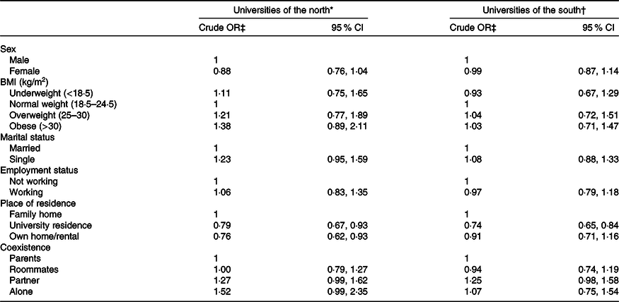 Table 2 describes the re-categorised characteristics of the population studied according to geographical location. It was observed that women accounted for 72·2 % of the studied population which had an average age of 20 (sd 4·52) years, without significant difference between north and south. There was no significant difference in the BMI distribution or the current situation in terms of work and study. There was a significant difference in relation to marital status and student accommodation and coexistence during the academic year. Students in the north lived in a significant proportion in university residences (16·6 v. 7·4 %) or alone (11·7 v. 7·3 %) compared with those from the south who in turn were more likely to be married (9·1 v. 7·9 %).
