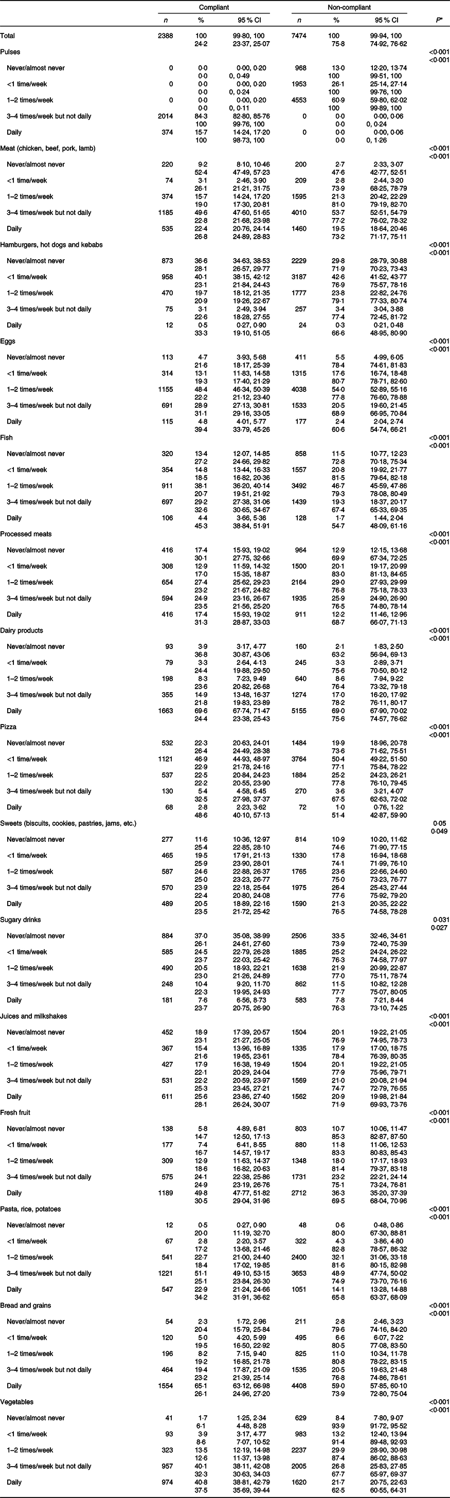 The foods whose daily or almost daily consumption is associated with higher adherence to the recommended frequency of consumption of pulses are hamburgers, hot dogs and kebabs; eggs; fish; sausages and cold meats; pizza; juices and milkshakes; fresh fruits; pasta, rice and potatoes; bread and cereals. On the other hand, for meat and dairy products, students who consumed these products never or almost never present the highest proportion of adherence to the recommended frequency of consumption of pulses. In the case of sweets and sugary drinks, compliance rates were similar across all intake groups but the group with the worst compliance was that which consumed sweets or sugary drinks 3–4 times/week.
