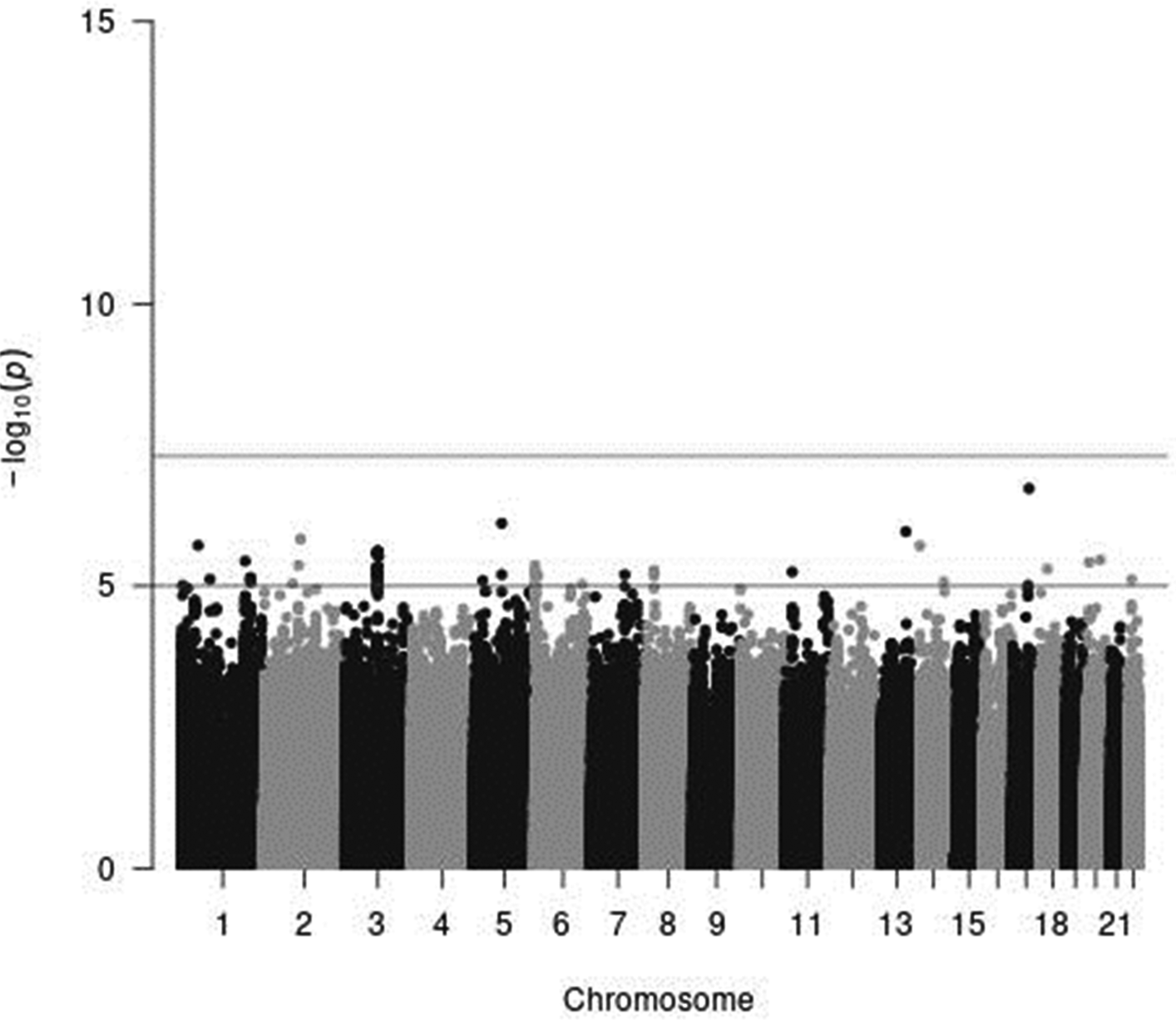 Fig. 4. A Manhattan plot of the results from the GWAS of meat intake (g/1000 kcal per d) in women. The x-axis indicates chromosomal positions, and the y-axis represents −log10 P-values obtained by linear model association analysis. The software qqman was used(Reference Turner38). Chromosomal position (GRCh37/hg19).