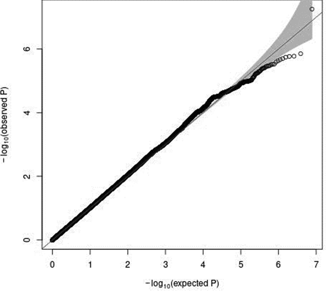 Fig. 3. A Q–Q plot (black) for the sex-stratified GWAS of meat intake (g/1000 kcal per d) in women. The x-axis shows the expected −log10 P-values under the null hypothesis. The y-axis expresses the observed −log10 P-values obtained by a linear regression model using PLINK(Reference Purcell, Neale and Todd-Brown27,Reference Chang, Chow and Tellier28) . The line represents y = x, which corresponds to the null hypothesis. The grey shaded area expresses the 95 % CI of the null hypothesis. The inflation factor (λ) is the median of the observed test statistics divided by the median of the expected test statistics. An R package for creating the Q–Q plot, GWAS tools, was used(Reference Gogarten, Bhangale and Conomos37). Chromosomal position (GRCh37/hg19).