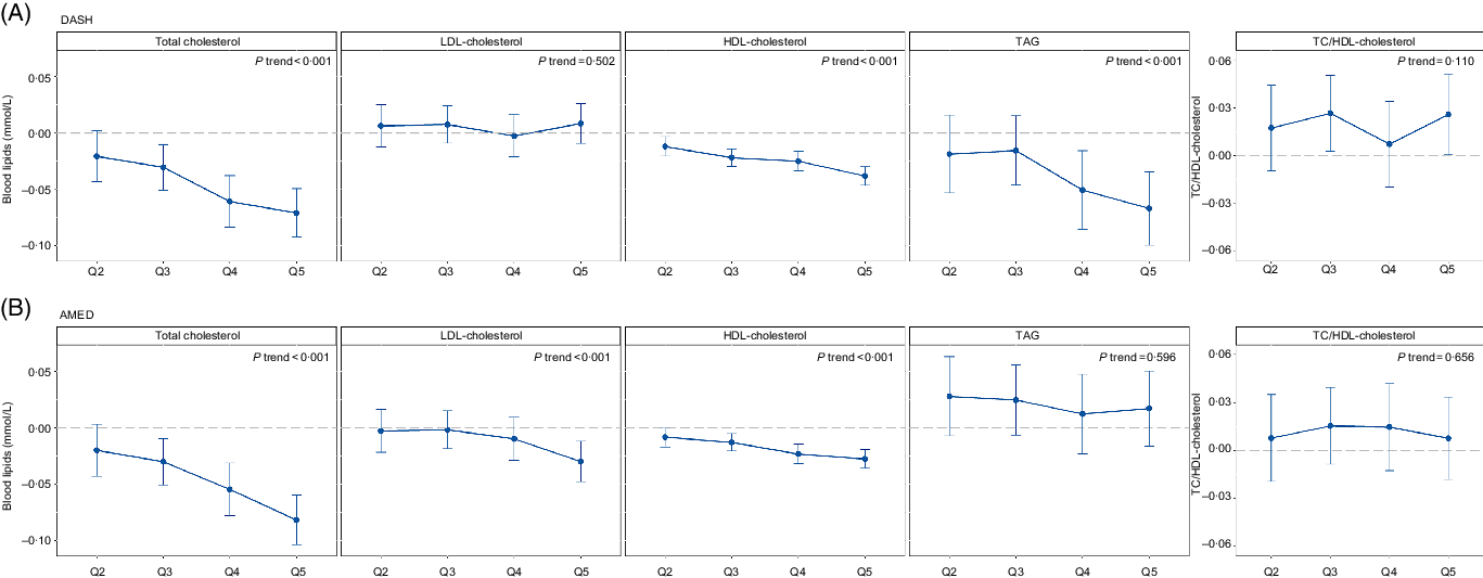Fig. 1. Association of the DASH and AMED scores with blood lipids. Dots and bars represent regression coefficients and 95 % CI, respectively. DASH, Dietary Approaches to Stop Hypertension; AMED, alternative Mediterranean diet; Q, quintile.