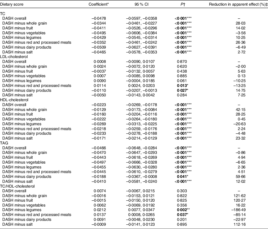 ‡ Reduction in apparent effect (%) = (Coefficient DASH overall – Coefficient DASH minus component)/Coefficient DASH overall × 100 %.