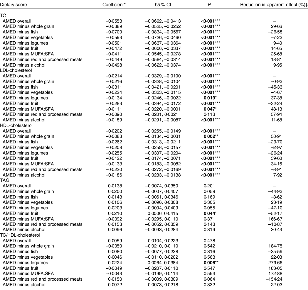 Table 3. Blood lipid associations with AMED scores and after alternate subtraction of each of its dietary components