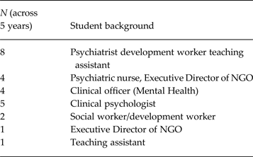 Two graduates (one AFFIRM fellow) have published their thesis (Udedi et al. Reference Udedi, Swartz, Stewart and Kauye2013; Benson-Martin & Milligan, Reference Benson-Martin and Milligan2015). Five graduates have manuscripts in preparation. Two graduates have been involved in the preparation and submission of grant applications, whilst two were enrolled in Ph.D. programs and five more were hoping to embark on a research career via a Ph.D. program. Udedi has secured a position as focal person for mental health within the Ministry of Health, Malawi, since completing the program, and contributed as a tutor to the AFFIRM OR short course.