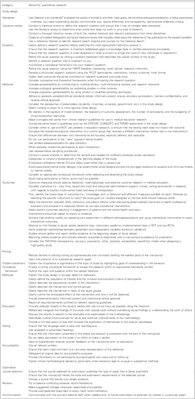 The simple thematic analysis of the recommendations for quantitative medical education research resulted in 3 themes (study design, writing, and submission), 14 categories, and 86 items (see Table 1).