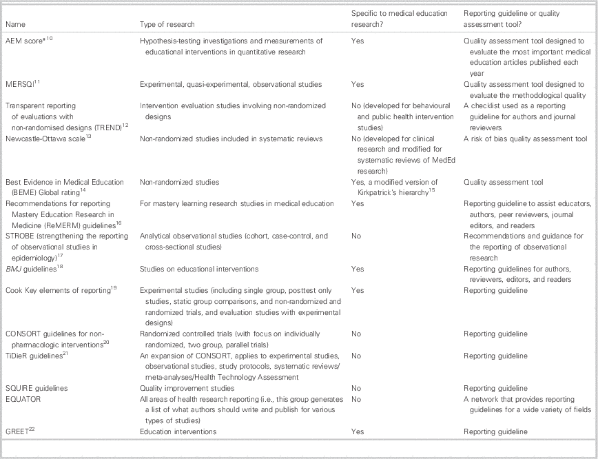 Table 2 Summary of reporting guidelines and quality assessment tools relevant to quantitative medical education research