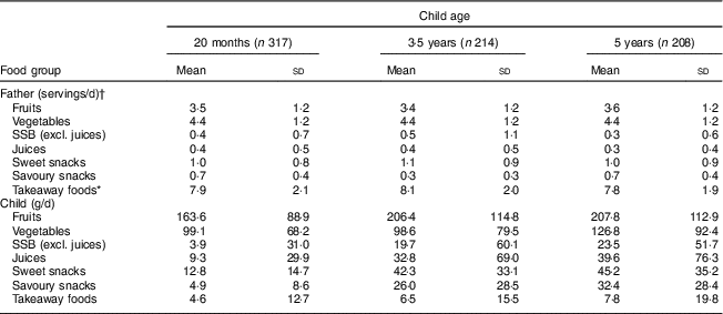 Table 2 Fathers’ and children’s intakes at child age 20 months, 3·5 years and 5 years, Melbourne Infant Feeding Activity and Nutrition Trial (InFANT) Program