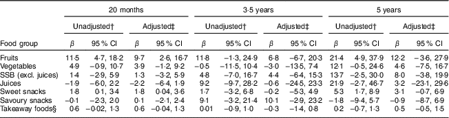 As fathers’ intakes remained unchanged over time, fathers’ intakes at child age 20 months were used as a potential predictor for change in child intake at child age 3·5 years and 5 years. Child intake at age 20 months was included in the model in order to model the change (Table 4). Fathers’ intake at child age 20 months was predictive of the increase in children’s intake between 20 months and 3·5 years of age for fruit, SSB and sweet snacks. Fathers’ intake at child age 20 months was also predictive of an increase in children’s intake between 20 months and 5 years of age for SSB and sweet snacks. These associations were only mildly attenuated after adjustment for mothers’ intake (Table 4). The relationship between fathers’ intake and increase in child intake of vegetables and juices (but not fruit) was stronger at 5 years than at 3·5 years. No evidence of any association between fathers’ intake and change in children’s intake of savoury snacks and takeaway foods was observed at any time point.