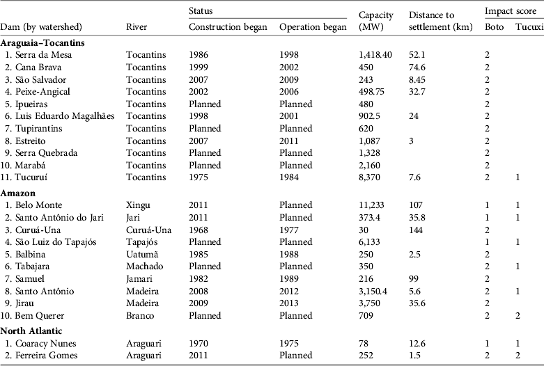 Table 2 The hydroelectric dams affecting the boto and tucuxi in Brazil, by watershed, with information on construction and operation dates, capacity, distance to the nearest downstream town, and impact scores (see text for details) for the two species. See Fig. 2 for the numbered locations of the dams.
