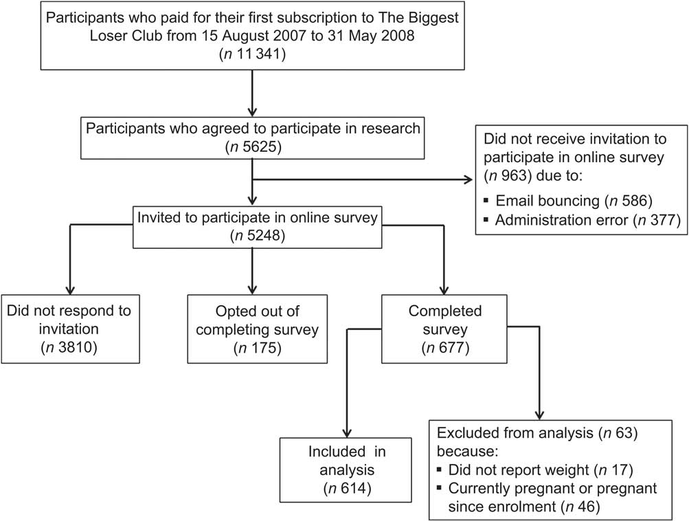 Twelve per cent (n 677) of eligible participants completed the survey. Sixty-eight per cent did not respond to the survey invitation, 17 % did not receive the email invitation to participate, and 3 % reported they did not wish to complete the survey. Sixty-three participants were excluded from the analysis as they did not report their weight in the online survey (n 17) or because they were or had been pregnant (n 46) since joining the programme (Fig. 1).