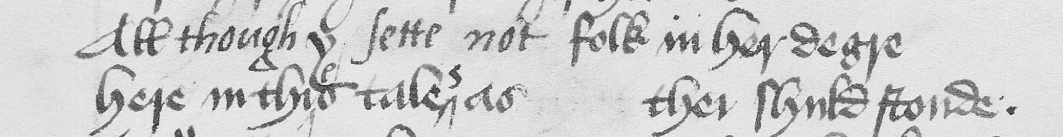 For that reader, a better version of Chaucer’s text was to be located in a printed copy. The annotator’s reliance on the printed edition is most striking at points where perceived or actual errors left by the original scribe were found and corrected. This is the case on fol. 12r, where the words have been rearranged in a pair of lines as follows: ‘All <though> y <sette not> folk in her degre / Here in thi^es tale^s as thei shuld stonde’ (see Figure 1.4).Footnote 86