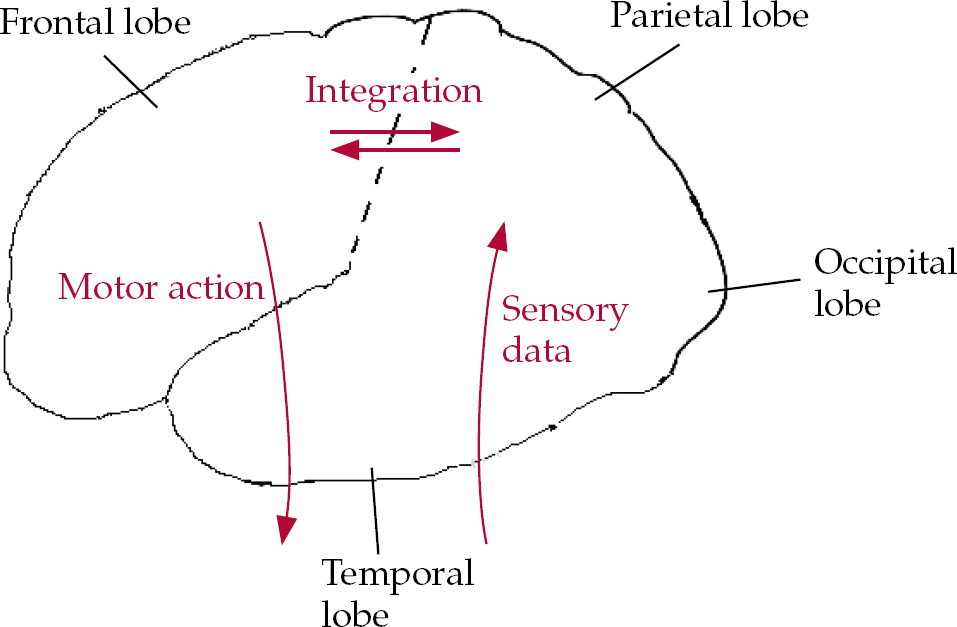 Although the sense organs send data to the primary sensory areas in the parietal (somatosensory), temporal (auditory) and occipital (visual) cortices for preliminary analyses, more complex computations occur elsewhere. Hence, there are streams of data leaving the occipital cortices along the ventral (‘what is it?’) and dorsal (‘where is it?’) pathways, to the temporal and parietal cortices respectively. Within the temporal cortices there are regions concerned with semantic knowledge – the identity and meaning of stimuli. There are heteromodal regions of the parietal cortex that are engaged in the analysis and synthesis of somatic, auditory and visuospatial information with reference to egocentric, bodily oriented coordinates.