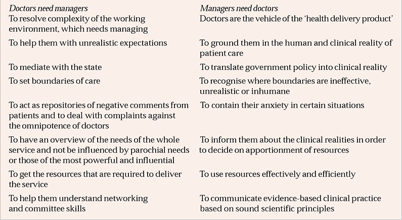 It is widely recognised that good relationships between doctors and managers are essential for efficient delivery of healthcare. In an audit of 35 clinical governance reviews in mental health trusts, the Commission for Health Improvement (2003) concluded that investigation of serious service failures often reveals inadequate teamwork, lack of clinical leadership or poor doctor–manager relationships.