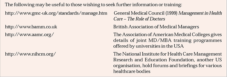 Various authors have put forward suggestions for establishing more common ground between doctors and managers (e.g. Reference AtunAtun, 2003; Reference Edwards, Marshall and McLellanEdwards et al, 2003; Reference MüllnerMüllner, 2003; Reference NashNash, 2003). Box 7 shows a distillation of these, and Box 8 gives the website addresses of a few organisations that offer further healthcare management information and training.