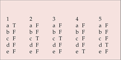 | e | F | e | F | e | F | e | T | e | F |