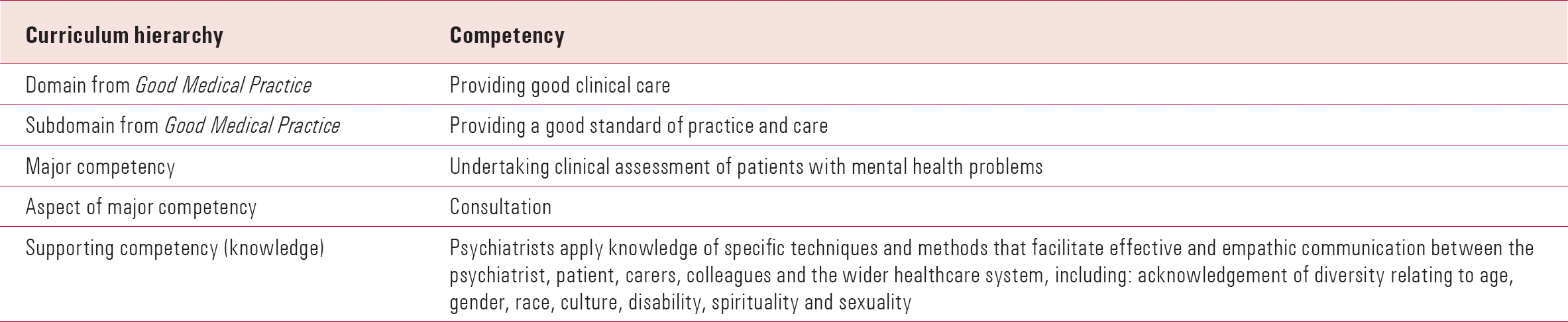 In the UK, PMETB required that all medical Royal Colleges could map their curriculum framework to the Good Medical Practice domains set out by the GMC. For the sake of simplicity, the Royal College of Psychiatrists' curriculum for specialist training is based directly on the Good Medical Practice framework. However, Good Medical Practice is quite complicated and not really intended as the basis for designing a curriculum, so mapping directly to this framework had some problems. In the original version of Good Medical Practice there are four main domains and the content is then organised in a hierarchical structure within each domain. Below the domain level is the subdomain, followed by major competency, aspect and finally supporting competencies.