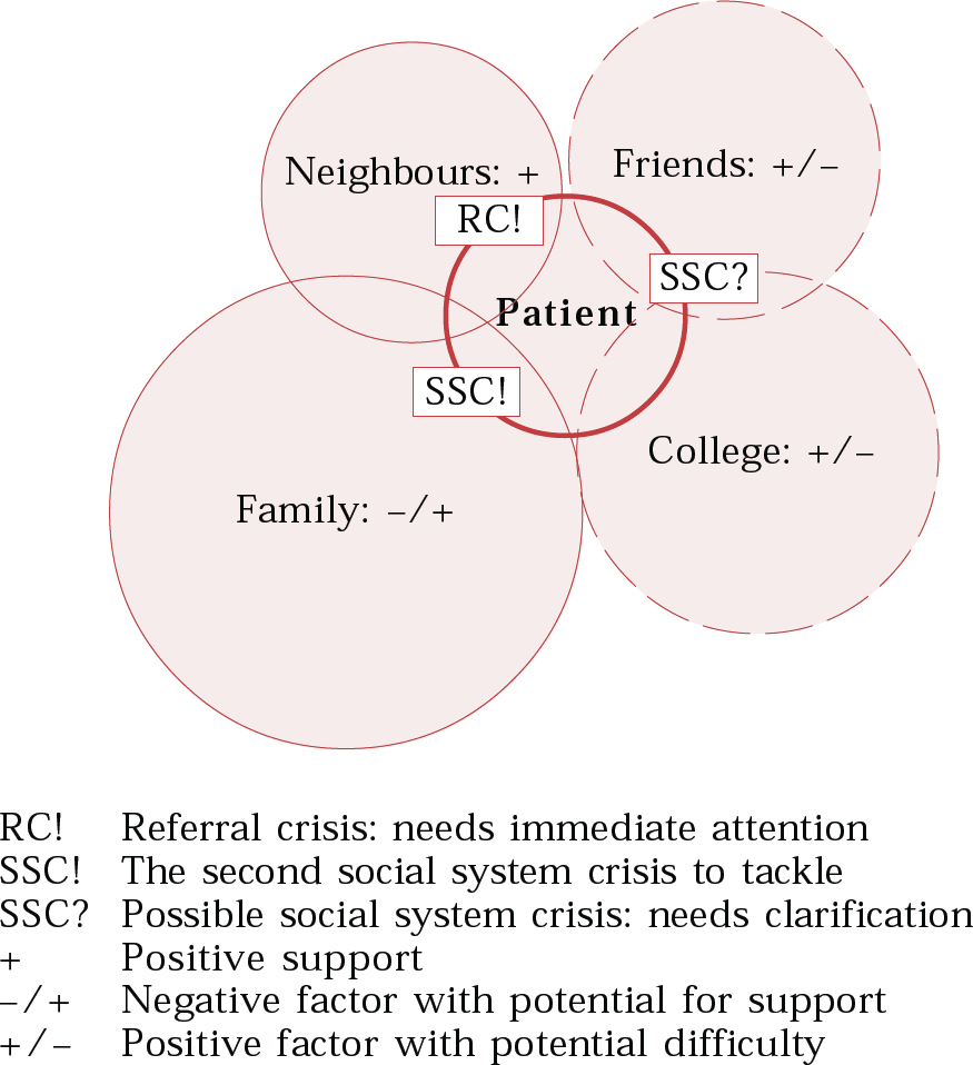 The dramatic referral crisis, described to the crisis resolution team by the duty doctor in ‘story so far’ format, conceals a background social systems crisis in the young woman's maturation and in her relationships within the family, especially with her parents: the family system seems most involved. Denial and communication difficulties were soon clear – but the need also to involve her college and her new friends is also evident (Fig. 1).