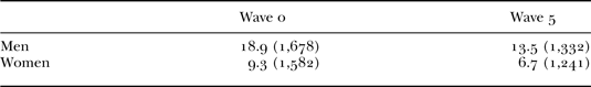 The distribution of the frequency of drinking in last 12 months and mean weekly units consumed in waves 0 and 5 by gender are given in Tables 1 and 2. Men's greater and more frequent consumption is confirmed, as is the overall decline in quantity and frequency over time for both genders. There were though some notable trends beyond this overall pattern. For frequency, there was a marked increase in abstinence in wave 5 compared to wave 0 for both men and women. For women in wave 5, not drinking was the modal consumption frequency. There were small increases in the proportion of men and women reporting occasional drinking between the two time-points. This increase in abstinence was concomitant with a decline in more frequent drinking, and most of this was accounted for by a reduction in daily drinking, particularly for women. In Table 2, the mean reduction in mean weekly units consumed was roughly equivalent for both men and women (around 28 per cent), though it was slightly greater for men.