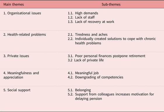 The current study investigated elderly workers’ motivation for a full or extended working life. Assistant nurses working in elderly care participated in the study, and five main themes with a number of sub-themes were developed from the interview data. The main themes were ‘Organisational issues’, ‘Health-related problems’, ‘Private issues’, ‘Meaningfulness and appreciation’ and ‘Social support’. Several of the main themes painted an alarming picture of the working conditions of the assistant nurses. For example, the theme ‘Organisational issues’ highlighted an unsustainable working situation with high demands, lack of staff and lack of recovery. In previous studies, work time and work pace are described as important for the retirement decision (Nilsson Reference Nilsson2012, Reference Nilsson2016a, Reference Nilsson2016b; Sandmark Reference Sandmark2014), especially for women (Nilsson Reference Nilsson2015). In addition, high demands at work can have both physical and psychological health effects, including an increased risk for depression and anxiety (Andrea et al. Reference Andrea, Bültmann, van Amelsvoort and Kant2009) and increased risk of cardiovascular disease (Allesøe et al. Reference Allesøe, Hundrup, Thomsen and Osler2010). Moreover, a high need for recovery is expected to double the risk of long sick leave two years later (DeCroon, Sluiter and Frings-Dresen Reference DeCroon, Sluiter and Frings-Dresen2003) and prospective studies have shown that it is also a valid predictor for cardiovascular diseases and psychosomatic complaints (Sluiter et al. Reference Sluiter, De Croon, Meijman and Frings-Dresen2003). ‘Health-related problems’ was a further main theme, and with increasing age, changes in health and in work capacity occur (Kiss, De Meester and Braeckman Reference Kiss, De Meester and Braeckman2008). Previous studies examining the role of different factors for an extended working life, within health care, found that perceived health was the most important factor in the retirement decision (Bengtsson and Nilsson Reference Bengtsson and Nilsson2004). Poor physical work environments or badly designed and demanding work conditions leave people worn out; as a result, they retire earlier (Ahola et al. Reference Ahola, Sirén, Kivimäki, Ripatti, Aromaa, Lönnqvist and Hovatta2012; Nilsson Reference Nilsson2012, Reference Nilsson2016b; Nilsson, Pinzke and Lundqvist Reference Nilsson, Pinzke and Lundqvist2010; Nilsson, Rignell-Hydbom and Rylander Reference Nilsson, Rignell-Hydbom and Rylander2011, Reference Nilsson, Rignell-Hydbom and Rylander2016; Schuring et al. Reference Schuring, Mackenbach, Voorham and Burdorf2011). The main theme ‘Private issues’ highlighted the role of economy in the retirement decision, indeed the role of economic incentives in the retirement decision has been found in previous studies (Bengtsson and Nilsson Reference Bengtsson and Nilsson2004). Economic incentives are also used by society to regulate the population's retirement age (Nilsson Reference Nilsson and Vingård2016c). In addition, the participants in the current study clearly expressed that the demanding work situation was having a negative effect on their private life. Previous literature has found that it is important to balance work and private life if individuals want to continue in an extended working life (Nilsson Reference Nilsson2016b; Nilsson, Rignell-Hydbom and Rylander Reference Nilsson, Rignell-Hydbom and Rylander2011), especially for women (Nilsson Reference Nilsson2015). Conflict between work and personal life can have negative outcomes, including burnout, depression, low job satisfaction and low psychological wellbeing (Munir et al. Reference Munir, Nielsen, Garde, Albertsen and Carneiro2012). In turn, these outcomes have been related to intention to leave the health-care profession, sickness absence and poor work performance. Work could be an antagonist to leisure activities, and this perceived obstacle is a reason for early retirement (Nilsson Reference Nilsson2012, Reference Nilsson2016b, Reference Nilsson and Vingård2016c, Reference Nilsson2017a, Reference Nilsson2017b; Nilsson, Rignell-Hydbom and Rylander Reference Nilsson, Rignell-Hydbom and Rylander2011). If work interacts with leisure activities and family commitments, retirement may be delayed (Fideler Reference Fideler2014; Mein et al. Reference Mein, Higgs, Ferrie and Stansfeld1998; Nilsson Reference Nilsson2012; Vercruyssen Reference Vercruyssen and Kumashiro2003). ‘Meaningfulness and appreciation’ was a further main theme. This theme highlighted that the job was viewed as very meaningful but that the competencies of the assistant nurses were downgraded. Previous studies with assistant nurses have found that they perceived their jobs as very meaningful (Nilsson and Nilsson Reference Nilsson and Nilsson2017a, Reference Nilsson and Nilsson2017b; Sandmark Reference Sandmark2014). Not surprisingly, meaningful tasks, using experience, knowledge and education in work increase work motivation and work satisfaction (Saurama Reference Saurama2004). In addition, employees close to normative retirement age who experience their work as important and meaningful more often want to go on and work in an extended working life (Nilsson Reference Nilsson2012, Reference Nilsson2016a, Reference Nilsson2017a, Reference Nilsson2017b; Nilsson, Rignell-Hydbom and Rylander Reference Nilsson, Rignell-Hydbom and Rylander2011). Similarly, previous studies have found that employees are more willing to extend their working lives if they can use their existing knowledge at work and have opportunities to gain new knowledge (Nilsson Reference Nilsson2012, Reference Nilsson2016a, Reference Nilsson and Vingård2016c, Reference Nilsson2017a, Reference Nilsson2017b; Nilsson and Nilsson; Nilsson, Rignell-Hydbom and Rylander Reference Nilsson, Rignell-Hydbom and Rylander2011). The final main theme was ‘Social support