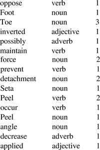 Mention and stop word filtering: [verb] oppose [noun] foot [noun] toe [adjective] inverted [adverb] possibly [verb] maintain [noun] force [verb] prevent [noun] detachment [noun] seta [verb] peel [noun] toe [noun] detachment [verb] occur [verb] peel [noun] toe [noun] peel [noun] angle [verb] decrease [adjective] applied [noun] force