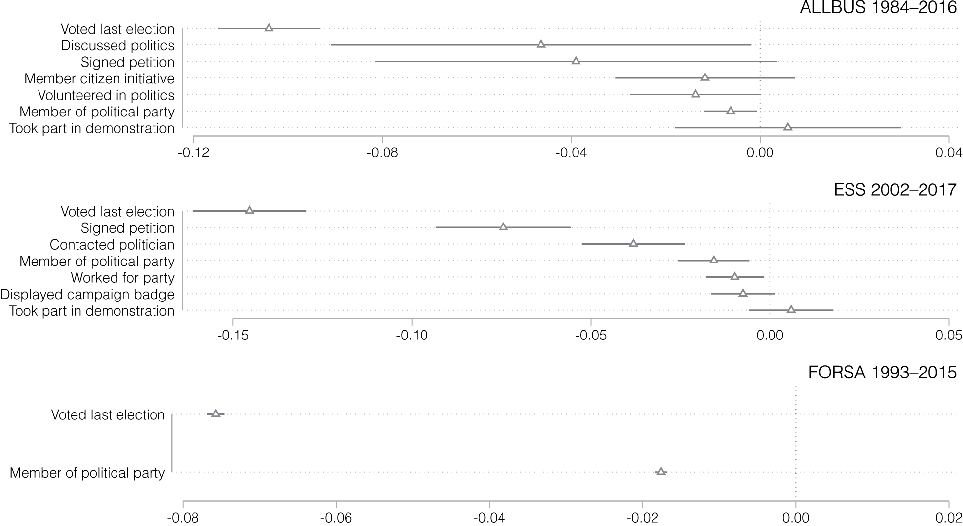 Note: Figure 3 plots the coefficients for individual-level regressions of turnout intentions on the indicator for LMAS. OLS regressions controlling for age, sex, education, and parents’ education and including month, year, and state fixed effects. Markers are point estimates, vertical lines, 95% confidence intervals. ALLBUS 1984–2016, FORSA 1993–2015, and Deutschland Trend 2008–2018 data.