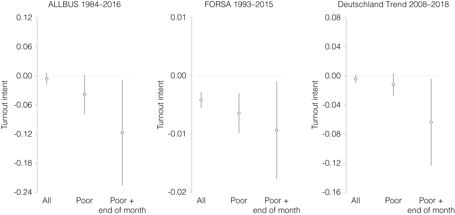 Data sources include observations from more than three million individuals interviewed in several large-scale opinion surveys since the 1990s, personal interviews, and turnout figures from over 1,100 elections that have taken place in Germany since 1945. I show that LMAS-induced financial hardship causes a decline in both the intention to vote and actual voter turnout. The negative effect of acute financial difficulties on turnout intentions surfaces in all the included surveys, is especially pronounced among the “working poor,” and is strongest when interviews are conducted towards the end of the month—when turnout intentions decline by about 4 percentage points. The effect of income shortages on actual turnout is even more conspicuous. In elections held at the end of the month during LMAS, turnout averages are 5 percentage points lower. The negative effects show up in all types of elections but are strongest in regional and local ones, and they are especially pronounced under conditions of high inequality.