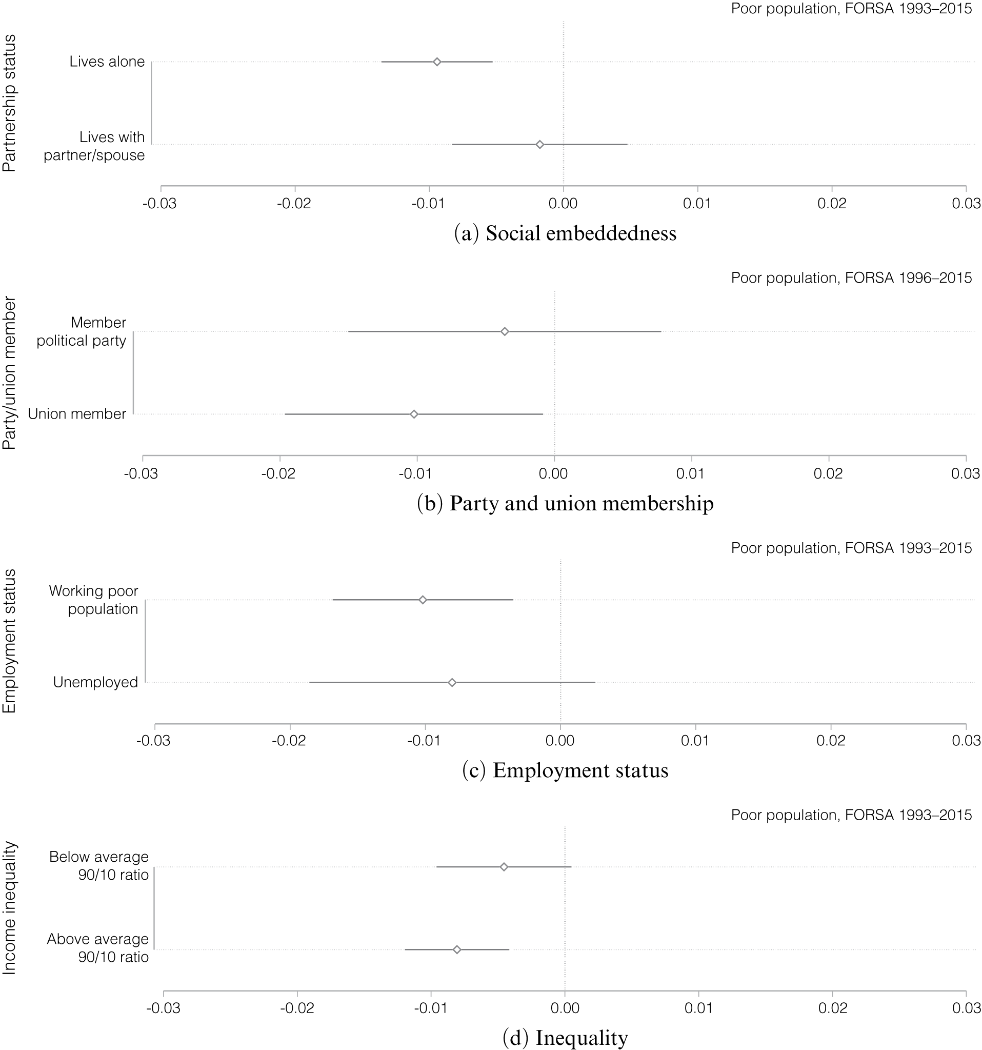 Among which groups do short-term financial difficulties result in reduced levels of political participation? Answering this question allows us to test additional arguments raised during the theoretical discussion. For this subgroup analysis I restrict myself to the FORSA data, the only dataset with sufficient power to allow for such an analysis, and subset the sample to the poor. One argument of the resource model is that that poverty reinforces social isolation. This effect should be most acutely felt among people who live alone. We can approximate the lack of social embeddedness by noting individuals’ partnership status. Figure 4a shows the effect LMAS-induced financial duress has on those people living with a partner versus those living alone (because they are single, widowed, or divorced). Among the latter group, a strong negative effect can be observed. By contrast, economic difficulties did not seem to translate into lower turnout intentions among those living in stable partnerships—an observation consistent with the expectation derived from the resource model.