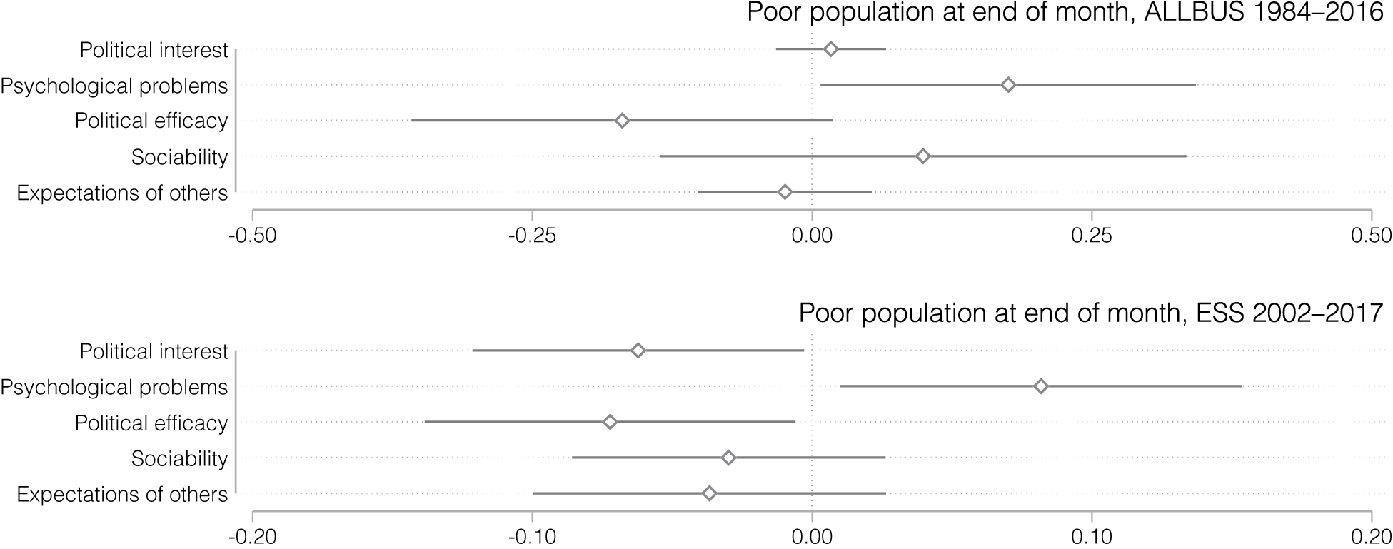 What mechanisms link financial hardship to lower political participation? Above I pointed to two plausible channels: Negative psychology, including reduced political interest and efficacy, especially among people feeling relatively deprived, and reduced social contact. The ALLBUS and ESS surveys include a range of questions that help capture these mechanisms. For the sake of clarity of presentation, I summarize groups of items into five scales by standardizing and averaging. Unfortunately, only the ALLBUS Survey includes measures for both mechanisms and turnout intentions, and many items (on psychological well-being and efficacy) are included only in two of the rounds. These data limitations precluded formal causal mediation tests (cf. Imai and Yamamoto Reference Imai and Yamamoto2013). Instead, I restrict myself to presenting the results from a regression of the indicators for the various mechanisms on the LMAS instrument.Footnote 18