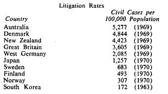 57 Such data as there are suggest that there are wide-ranging differences among societies in the frequency with which judicial intervention in dispute settlement is sought. This is amply demonstrated by the data presented below, a simple index of civil cases initiated per unit of population for selected countries. Even allowing for the crudeness of these data, the table does more than suggest the wide