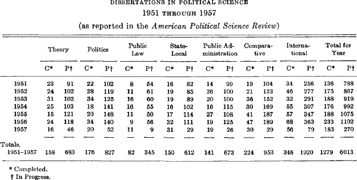 The compiler of this list is indebted to Professor York Y. Willbern, Director of the Bureau of Government Research, Indiana University, for the chart below which lists, by subject category, the number of dissertations completed and in progress, 1951 through 1957. In the “dissertations completed” group, the percentages by field for the 1951–57 period are as follows: international relations—27; comparative government—18; American politics—14; theory—12; state-local—12; public administration—11; and public law—6. There appear to be no significant trends during the seven years, unless the rise in state-local dissertations during the last two years should be considered worth noting. Finally, it may be noted that international relations has a substantially higher percentage of dissertations in progress than it has of dissertations completed, high as that proportion is.