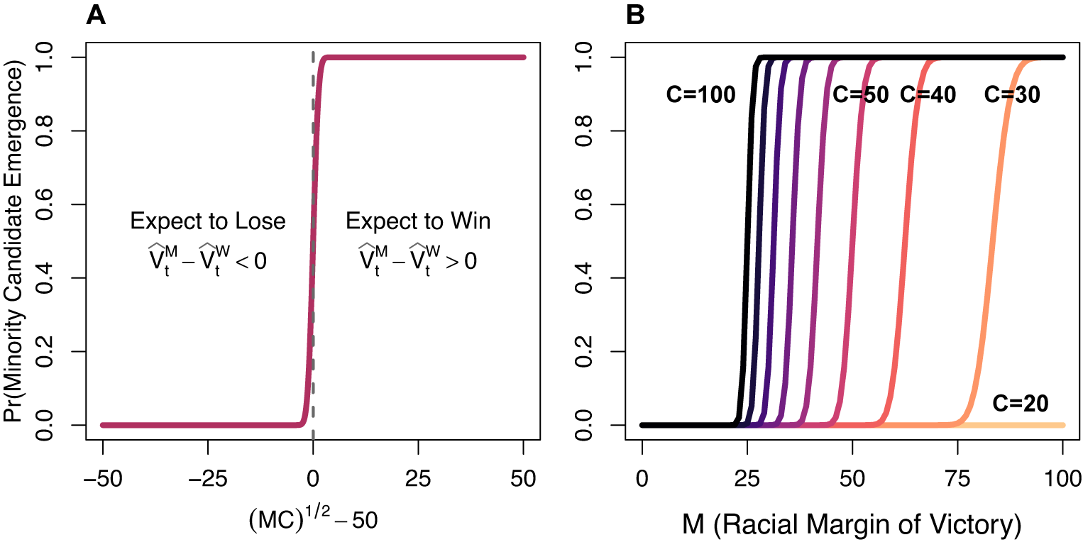 While each theory advances our understanding of minority representation, there are several unsolved problems. First, previous research does not explicitly specify a condition under which potential minority candidates run for office (e.g., minority candidates emerge when A is greater than B). Next, while both theories recognize that white voters are less likely to vote for minority candidates, they do not fully quantify the variation of white crossover voting in different elections and explain how minority candidates respond to it. Finally, neither camp provides any quantitative and theoretical prediction about the probability of minority candidate emergence and electoral success. Instead, previous research leaves any predictions to associated statistical models, the details of which (e.g., functional form) are rarely theoretically determined. Indeed, almost all predicted probabilities reported in the literature are not predictions from theoretical models but rather simulations based on statistical models (with estimated coefficients and some typical values of independent variables). These simulation-based probabilities are extremely dependent on specific data and statistical assumptions that one employs and are often not available to (and used by) other researchers (but see, Lublin et al. Reference Lublin, Handley, Brunell and Grofman2019).Footnote 5