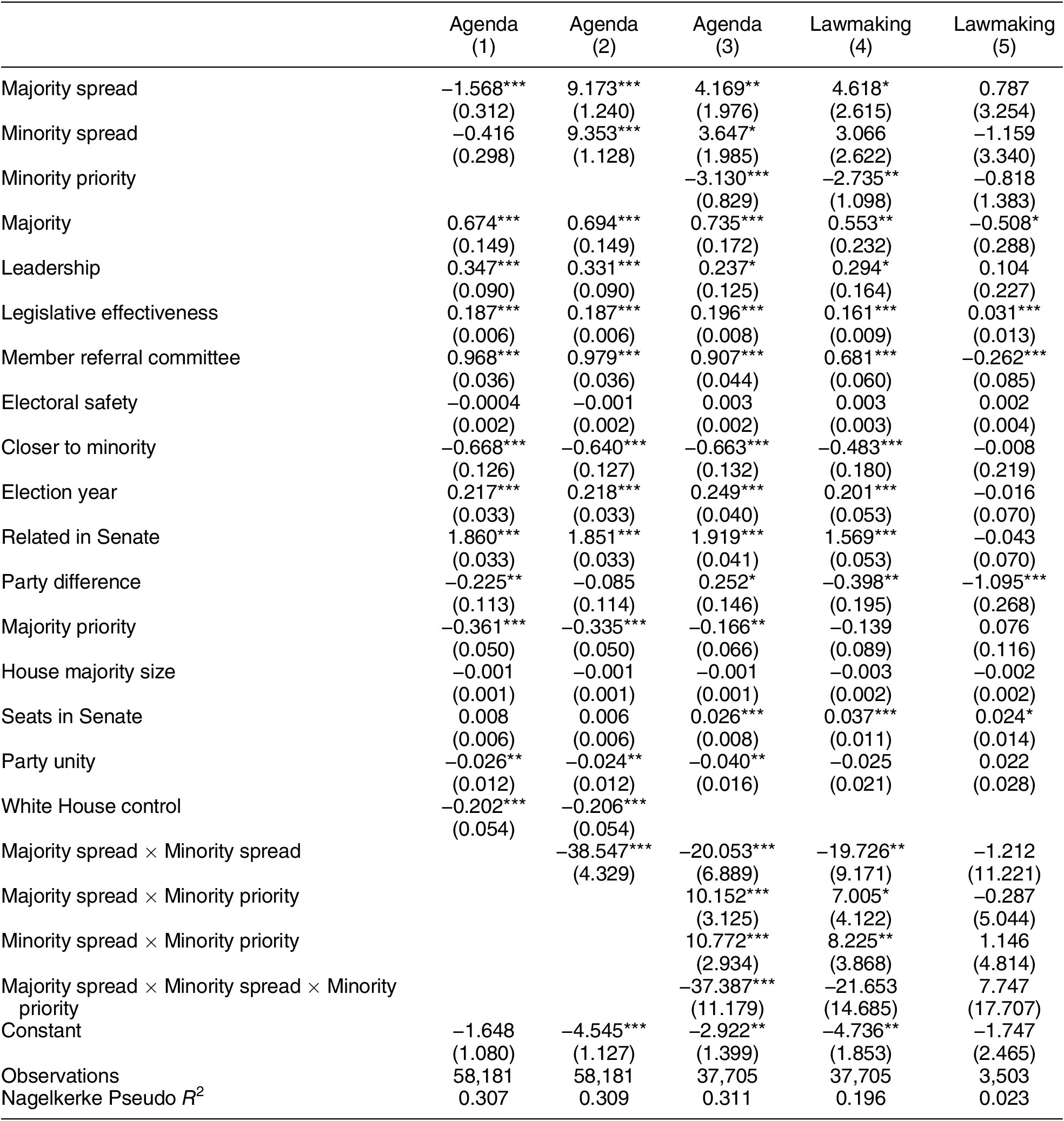 Results of models assessing our theory of minority party capacity in predicting whether bills reach a final passage vote in the House are in columns 1–3 of Table 1. Column 1 shows the independent effects of our measures of majority party constraints and minority party cohesion (majority spread and minority spread, respectively) on the likelihood that each bill received a vote on the floor. In column 2, we added an interaction between the two spread measures, assessing the interactive effects of majority party constraints and minority party cohesion. In column 3, we added our measure of minority party motivation (minority priority) and include a three-way interaction among all three variables. As a result, the third column only includes years of divided government.
