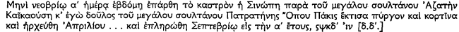 In the month of November on the first day of the week [?the first Sunday of the month?] the citadel/fortress of Sinope was taken by the great Sultan ‘Izz al-Dīn Kaykā’ūs; and I, the slave of the great Sultan, Badr al-Dīn Abū Bakr, this tower and curtain wall; it was begun in April and finished on 1st September 6724/1215.