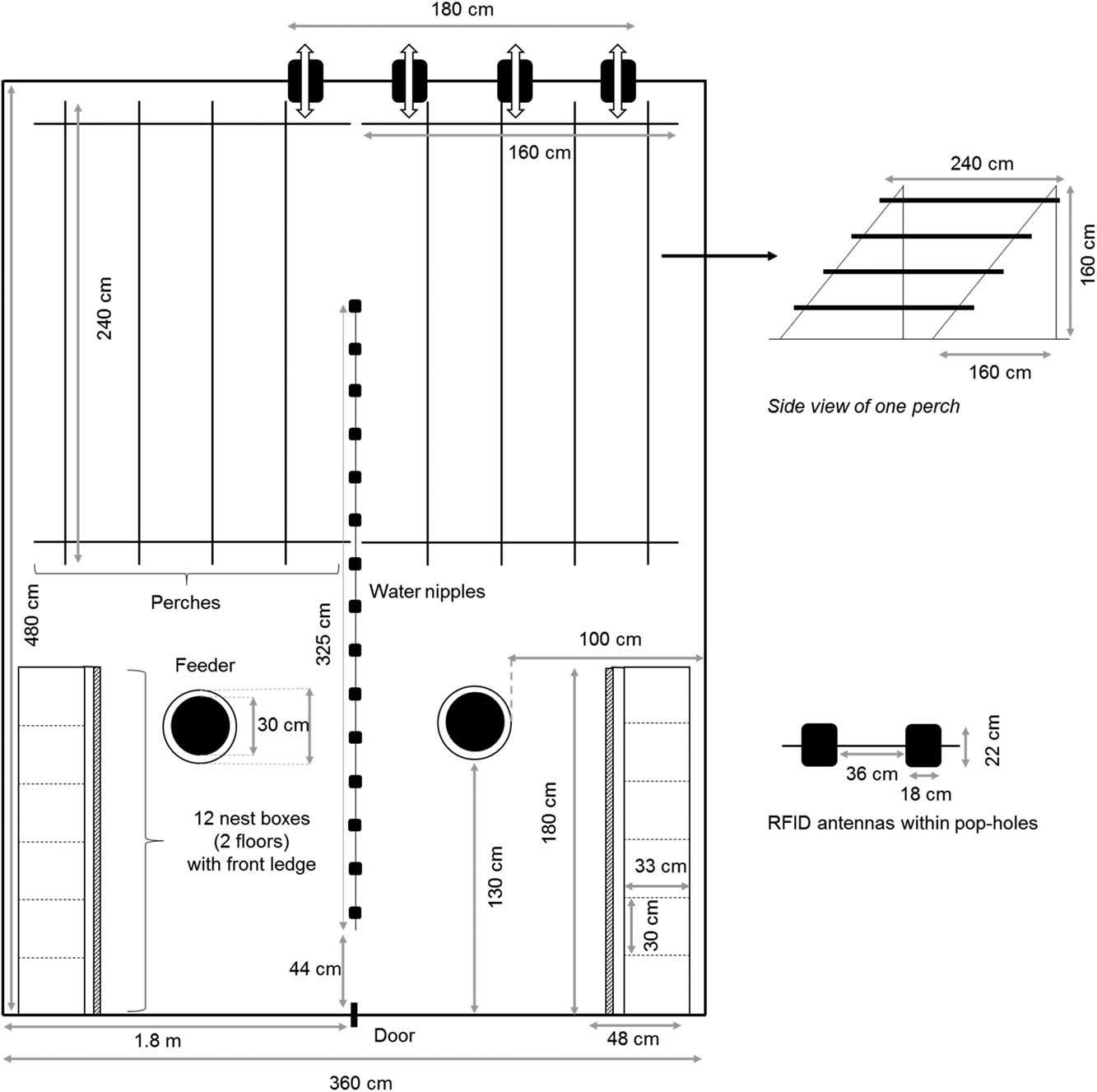 Figure 1 A top-down schematic of the hens’ indoor pen set-up showing location of the range pop holes (including radio-frequency identification (RFID) antennas), perches (side view included), nest boxes, feed and water. Each indoor pen had identical resources and configuration.