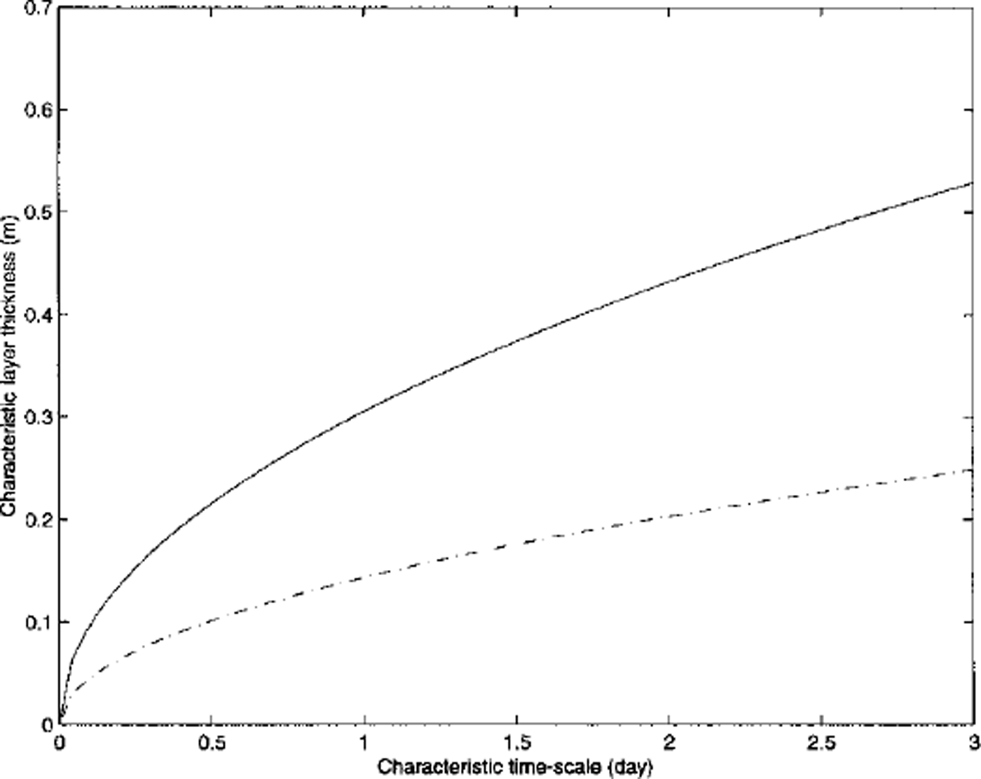 Fig. 1. Relationship between characteristic layer thickness and time-scale for two cases, representing the mid-winter multi-year ice condition (solid line) and the freeing first-year ice condition (dashed line) using equations (13) and (14). the two conditions were given by setting t = −30°c and s = 3.2 ppt and t = −5.0˚c and s = 8.0 ppt, respectively.