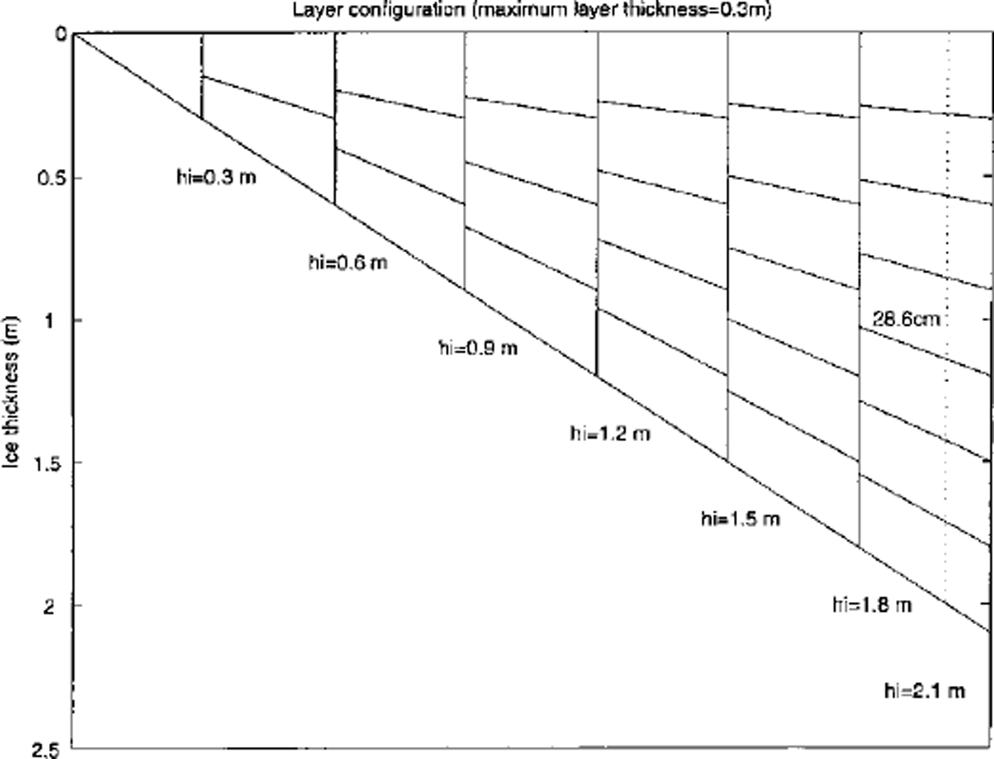 In previous models, the number of ice layers was fixed, making individual layer thickness dependent upon total ice thickness. In order to allow the models to obey thermal relaxation and to properly simulate the thermal inertia of the ice, these models used relatively thin layers. For example, a layer thickness of 10 cm was used in MU71, and 10 layers were used in EC93. Defining many layers carries a relatively high computational burden, and in climate models, where computational efficiency in each gridcell is critical, the burden can be large. This is particularly true in regions such as the Antarctic where seasonal sea ice is often very thin (and so many layers introduce an unnecessary restriction). We resolve this problem of matching layer thickness to forcing time-scale, by fixing the maximum layer thickness and changing the number of layers according to thinning and thickening of ice so as to avoid the burden of more ice layers than required to satisfy the thermal equilibrium condition.