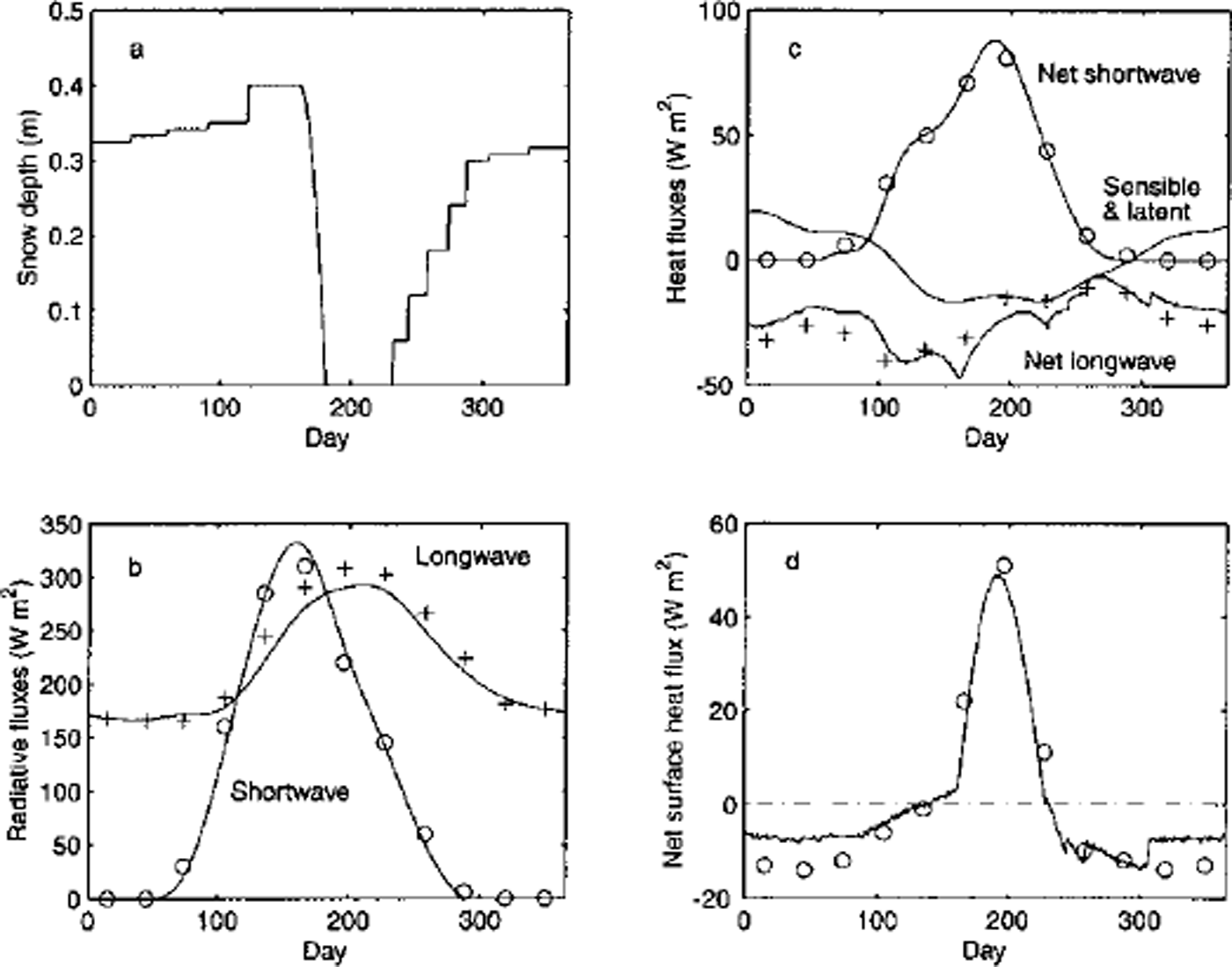 Fig. 3. Results from the control run. (a) the annual cycle of snow depth from the control run. note that it increases in an incremental manner (given) but decreases continuously (model calculated), ( b) the prescribed forcing of long- and shortwave radiation. plus and circle symbols indicate the monthly-averaged values used in mu71. (c) the prescribed net shortwave radiation (as albedo is prescribed in this control run) and the sum of the sensible- and latent-heat fluxes, and the calculated net longwave radiation. for comparison, circle (net shortwave) and plus (net longwave) indicate the values used in mu71. ( d) the net heat surface flux and circles from mu71.